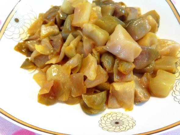 3、倒入榨菜片炒,加适量水,放入猪肉片及调料,炒到榨菜熟了即可。