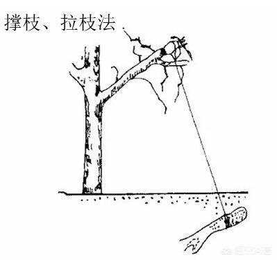 方法:在生长季节用铁丝或绳子、木棍使枝条角度开张,将可供利用的内膛枝、徒长枝拉向树冠缺枝部位,见下图。