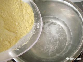 3、将清水倒入锅中烧开,将混合好的面粉徐徐撒入开水锅中再关火。(待玉米面完,水也干了)