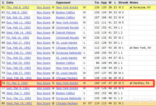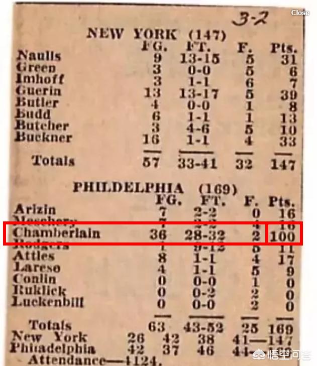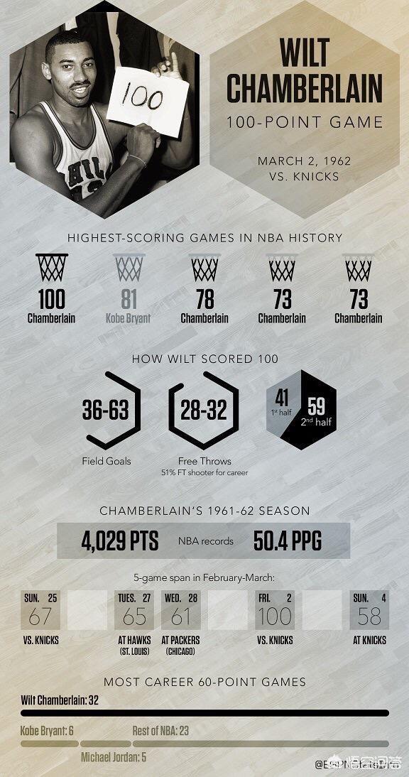 1962年3月2日,张伯伦代表勇士(当时是费城勇士)出战纽约尼克斯,上半场,张伯伦拿下41分,下半场59分,本场比赛达到恐怖的100分。张伯伦63投36中,罚球32中28。那场比赛,没有加时赛,四节100分,以169-147战胜了尼克斯。