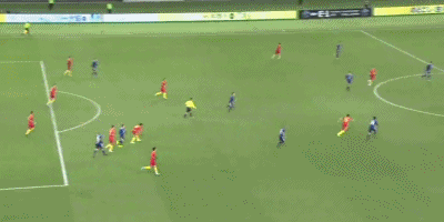 中日双方都有这个问题,咱就以中国队为例,中国主打两个边路,但是实际上我们看到,两个边路并没有传出几脚准确或像样的传中,李学鹏有速度能突破,但每次都有两个人围追堵截,传个球出去必须人仰马翻,傅欢必须靠速度生生超出一个身位才有可能传球,因此每次进攻都很赶吃力,这是球员的技术问题吗?有,但是更多的还是球队整体缺乏有效的跑位接应拉扯,让进攻又个人承担,这样一成功概率就很低了。我们看看中国最好的一次进攻,其实是傅欢传球后前插,接球队员没有像往常死板的二过一再传给他,而是在傅欢带走一名防守队员后转身塞给反插的于大宝(如下图),而这种变化,在中日双方都很少,这或许就是种差距。