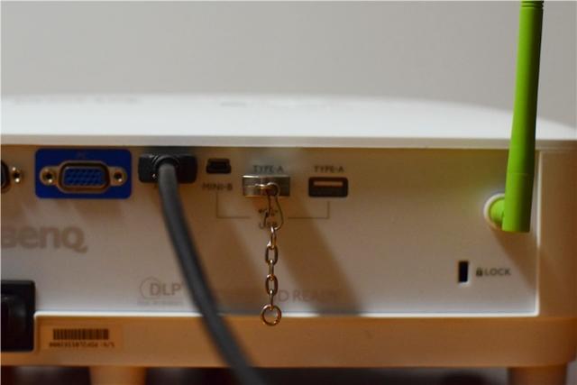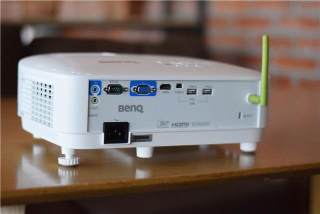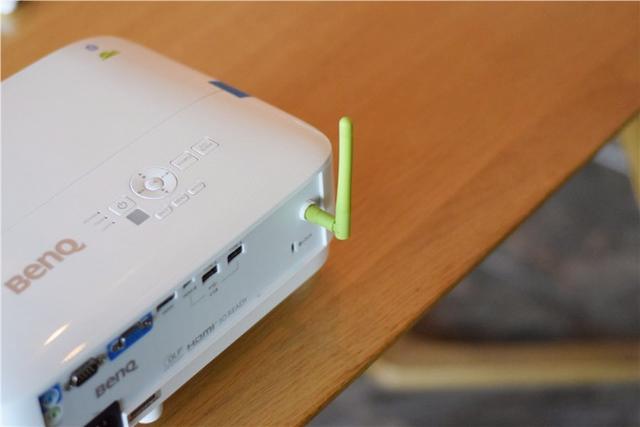 在投影仪的后侧有着丰富的连接插口,例如市面上主流的HDMI接口、VGA接口等都有,同时,还具备两个USB接口,方便U盘的插入,在接口的旁边有一个绿色的天线,多数人会误以为它是WiFi天线,其实,这根绿色的天线是明基E520用来自创热点的,在没有WiFi的情况下,明基E520可以提供热点连接外部设备,形成一个类似电脑局域网的环境,从而让文件可以传输到投影仪上进行投射,非常的方便。