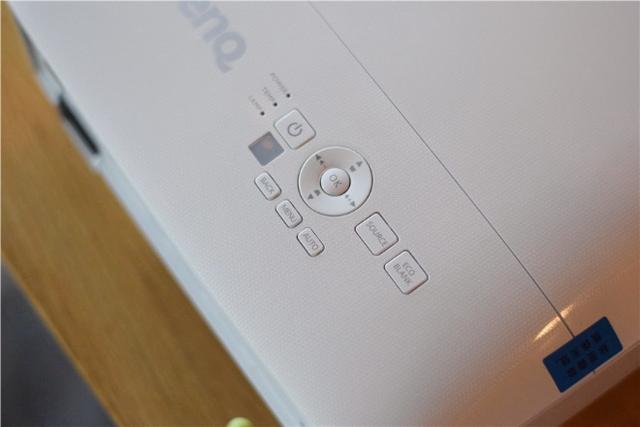 在投影仪的顶部有物理按键区域,其中的按键还是非常丰富的,包括电源按键、菜单键、信号源按键等,虽然,随机有配送遥控器,