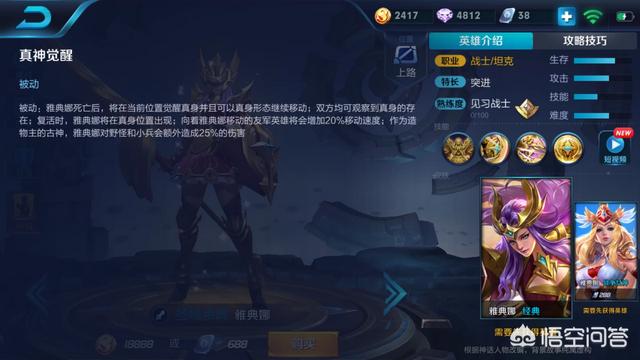 由于雅典娜技能的高机动性,打野效率极高,闪电般的支援和抓人速度带节奏非常轻松,死后可以探视野,当一个小照明灯,还有她能抗能打的身板,攻守兼备,进退自如的英雄。中后期装备成型时,单挑不在话下。