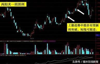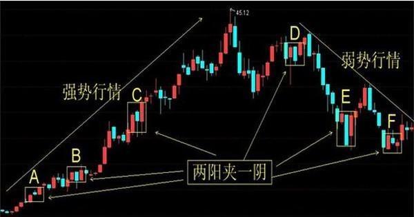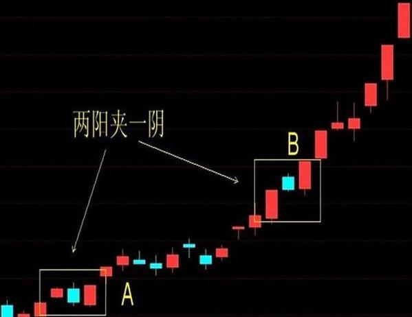 两阳夹一阴由三根K线构成,第一根为阳线,第二根为阴线,第三根为阳线,也即两根阳线夹着一根阴线,所以又被称之为“两阳夹一阴”是看涨的信号。此种K线组合既可以出现在上涨的途中也可以出现在下跌的途中,若出现在下跌的途中意为反弹信号;如果出现在上涨的初期,或上涨的途中,那么看涨的可靠性会更强。