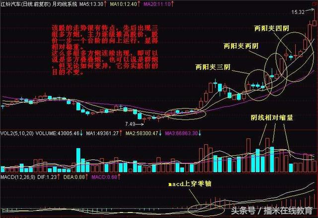 3、除了两阳夹一阴形态,还要看所处位置。如果在都处在均线下方的两阳夹一阴,信号相对较弱。最好是均线上方的两阳夹一阴,成功率较高。