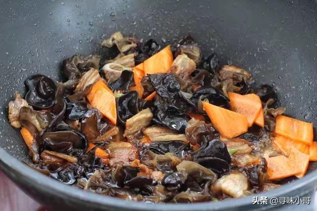 6.再将木耳和胡萝卜放入锅中,大火快速翻炒断生。