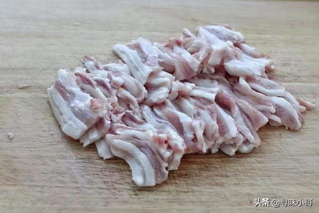 1、将五花肉洗净切成0.5厘米的宽度肉片。