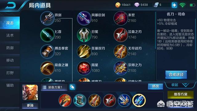 在装备上一刀推荐如图展示,不仅能让我们的输出最大化,因为高伤害的缘故配合泣血又有非常高的续航能力,攻速打野刀能让我们的平A顺畅的打出伤害,而作为核心的无尽和破军更是必不可少,名刀更是让我们不至于连反应时间都没有就被击杀,给与了我们反击或是逃跑的时间。由于破军太过于昂贵,可以替换为宗师之力也是非常合适的。
