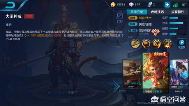 我们先看看猴子的特点,猴子优点是操作简单,后期收割能力强,被动及一技能神技,一技能无敌,免控,护盾,猴子强不强在于入场时机和一技能使用。缺点,发育期长,同时猴子也是脆皮英雄,一旦被控也是秒死。