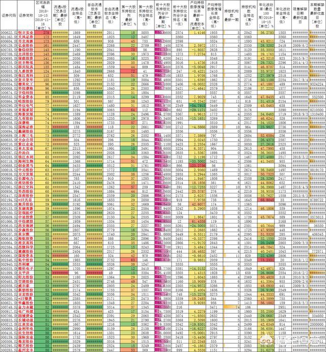 上图是通过wind统计的18年10月15日——11月16日全部3560只A股中,涨幅超过80%的个股的行情和一些数据,同一列中颜色越冷值越小,色条越短值越小。