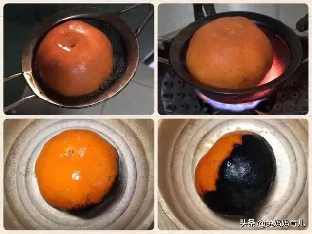 冬天也正是橘子上市的时节,取橘子一个,最好是有籽的传统橘子,实在没有的话,蜜桔也是可以的,用筷子在橘子中了戳一个洞,倒入少许菜籽油,放在炉子上烧,烧至橘子外皮大部分变成深色,中间的油冒泡,就可以关火,待温凉后吃橘子肉啦!