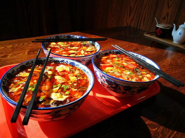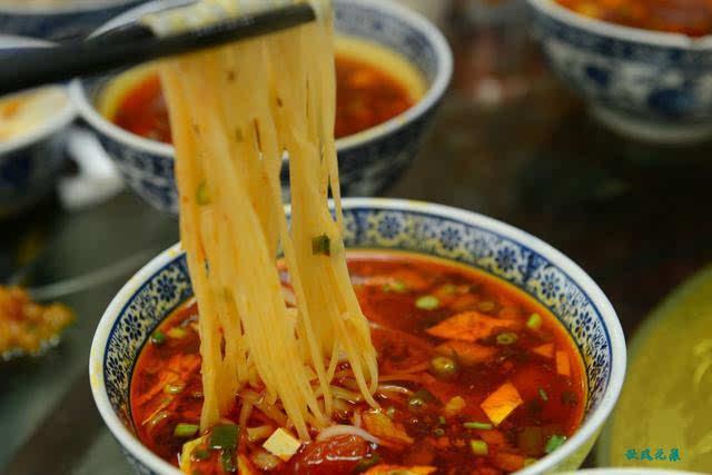 岐山臊子面在美食界可是顶顶大名,一碗地道的臊子面必须具备“薄、筋、光、酸、辣、香、煎、稀、汪”这九大特征,所谓薄筋光指的是面条,酸辣香指的是味道,而煎稀汪则是指汤宽面少、烫嘴、油多。一碗臊子面里,底菜、漂菜和肉臊子一样也不能少。
