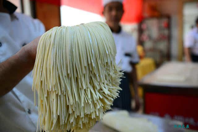 陕西的扯面,那可是有3000年历史滴,而宝鸡的西府扯面,又号称最正宗,盖因为西府地产的小麦品质很好。醒好的面,拽着两头,扯成宽条下锅煮,陕西八大怪里的“面条像裤带”说的就是这个扯面,最经典的吃法当然是油泼面,好吃到没朋友,百吃不厌。