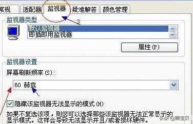 接下来单击高级属性设置界面中的“监视器”标签,从中可以看到显示器的刷新频率设置为“60”,这正是造成显示器屏幕不断抖动的原因。此时将新频率设置在“75”以上,再点击确定返回桌面就可以了。