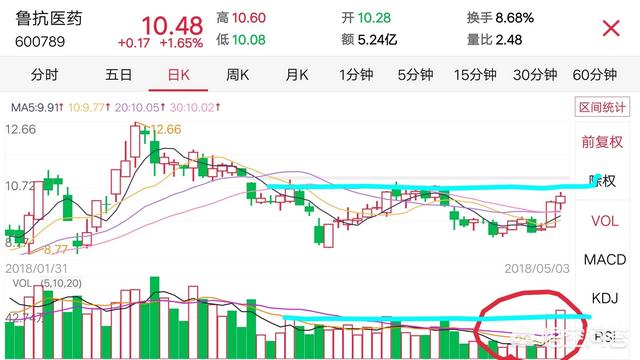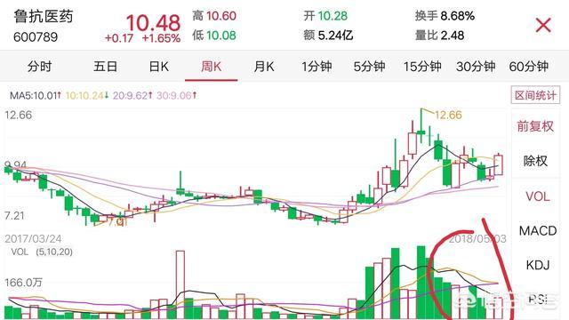 量能,日两结合周量参考可以几乎轻松应对一切,特别是量能平均移动线5,10,20的运动方向更应该关注,下面个两例图他家看看。上图中鲁抗在前面的下跌调整中5量能均线天下行穿越20,10天然后随着量能的萎缩5天平均量能线在底部走平随后在这几天放量开始上穿10天与20天形成了交叉,这样在这种量能形态下短线可以看好,如果这几天可以继续走强周级别的走势也会得到改善,当前周线还是有点偏空,5天量能移动线还是处于下行探底的状态。