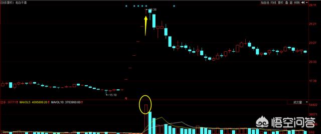 2、2017年11月15日的老白干酒,经历复牌连续一字板补涨后,11月15日当天出现巨量换手,成交也放出天量。此后股价就一路下行,至今也没回到过当天的高点。