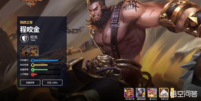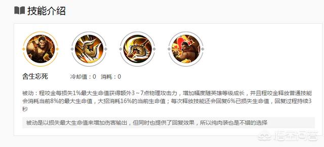 程咬金能排第一名就是因为它的被动技能,它的被动技能是血量越低,攻击力越高,打人越疼。程咬金称为团战搅屎棍,出纯肉装的他本身很肉特别能抗,血量低了以后输出又特别高,真的是输出很强的一个坦克英雄。
