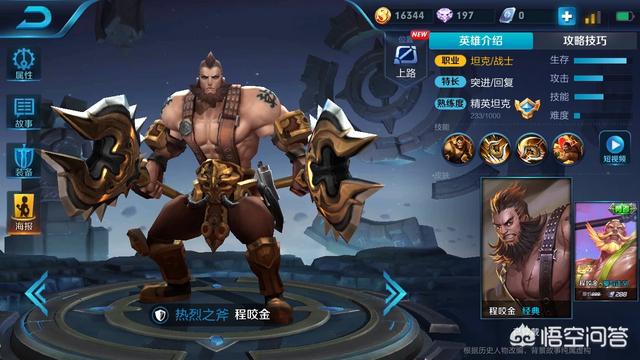 会对地面震动,造成减速和击飞,击退效果,并且大招畜力越久伤害越高,一技能使用后会强化下三次普攻。满身控制技能的苏烈攻击对方时候经常打断对方技能的释放,从而造成很高伤害。三,程咬金