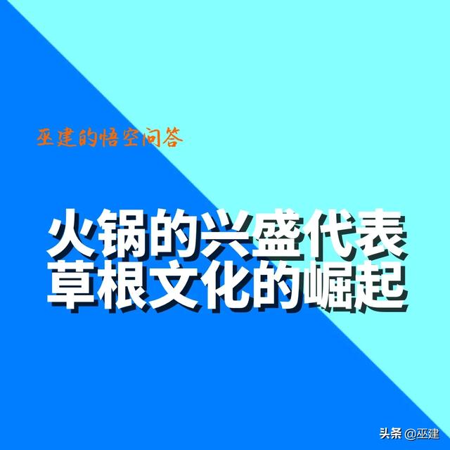 巫建我之所以说火锅代表着草根餐饮文化, 也就是大众餐饮的兴起火锅刚好符合了大众餐饮的条件, 西餐和一些高端餐饮虽然高雅但是老百姓们吃不出众餐饮的气氛太拘束。唯有火锅可以与民同乐,说到底就是接地气!以上仅个人观点如有不妥请指正,我是巫建从事火锅底料行业23年,我深爱着这个行业。每天都在这里分享传播川菜火锅文化以及,餐饮经验希望大家能够愉快交流谢谢。#火锅# #海底捞# #巫建#