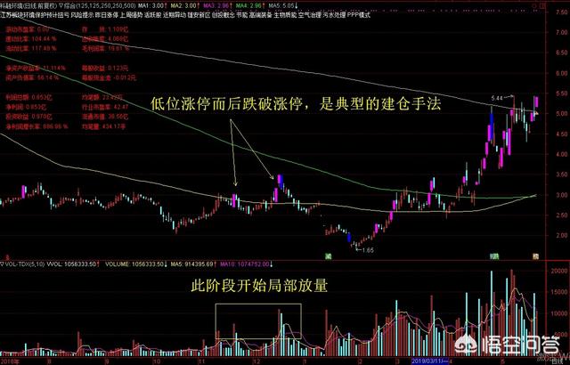 一是手法凶悍利用涨跌停建仓洗盘。下图是科融环境2018年底以来的日线走势图,粉色的K线是涨停K线,紫色的K线是跌停K线,科融环境在半年的时间内共出现了19次涨停、8次跌停,极端行情占全部交易日的25.5%。主力会利用涨跌停建仓洗盘,如图所示,低位涨停而后又跌破涨停K线,是典型的利用涨跌停建仓的手法。在拉升过程中也是高举高打,连续涨停后又是深幅打压跌停洗盘。大家也可以自行翻看一下它的分时图,例如:1月28日的分时图是典型的跌停建仓形态,5月24日的分时图是典型的涨停洗盘形态。