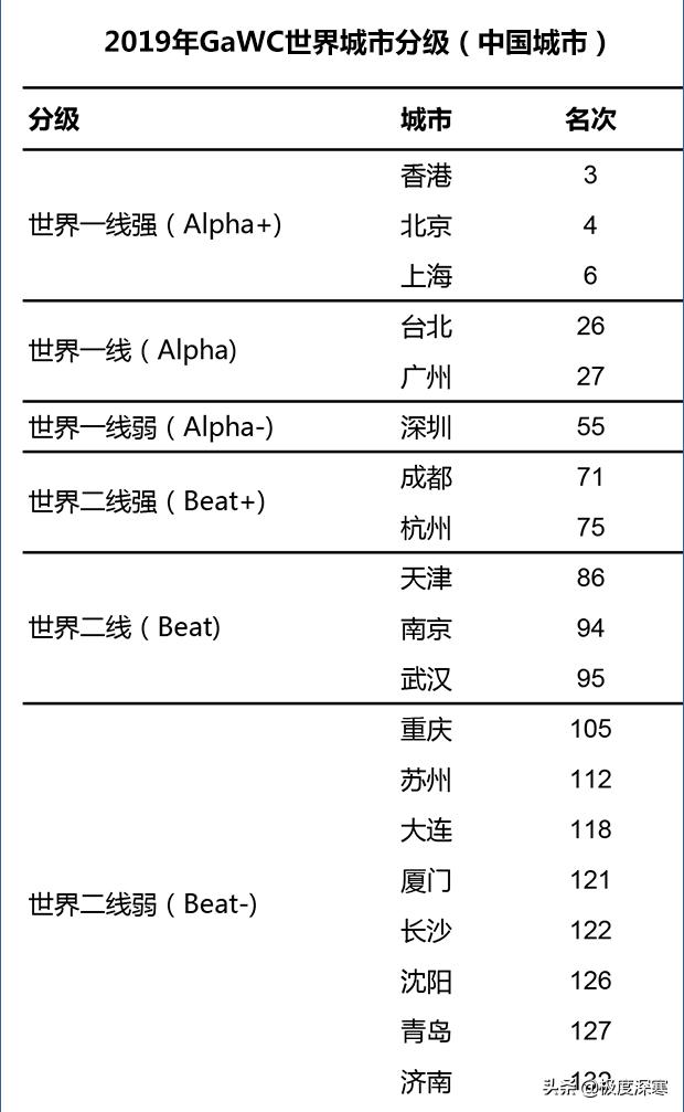 全球知名城市评级机构GAWC对中国城市评级如下: