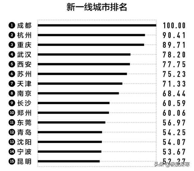 成都连续几年都是新一线的首位城市,新一线城市还包括,天津,苏州,重庆,南京,沈阳,西安,杭州,宁波,武汉,郑州,长沙,沈阳,厦门,东莞等15个城市。