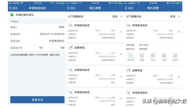 第三步:提交成功后,用户可通过【首页】→【网办进度】功能随时查看业务办理进度,车管所工作人员将在1个工作日内完成业务受理。