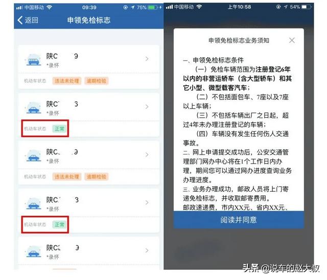 第一步:用户选择需免检车申领检验标志的机动车。认真阅读免检车申领检验标志业务须知后,点击【阅读并同意】进入车辆信息确认页面。对于交强险和车船税联网核查是否通过的,分别进入两个不同的业务操作流程。