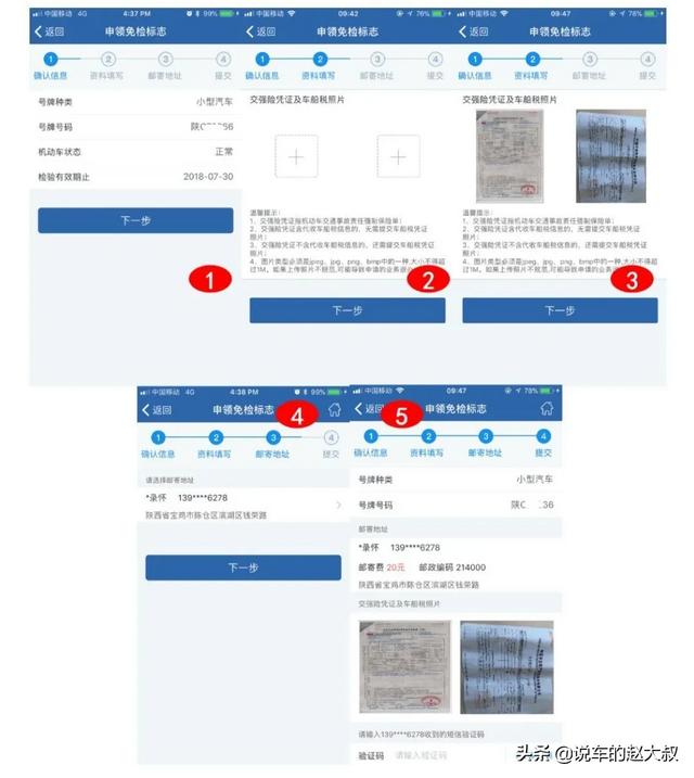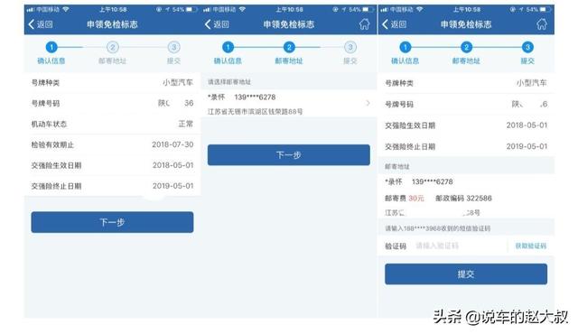 第二步:【交强险和车船税联网核查通过】确认车辆信息页面,包括号牌种类、号牌号码、机动车状态、检验有效期止、交强险生效日期、交强险终止日期信息,点击【下一步】进入邮寄地址选择页面,选择邮寄地址后,进入信息确认提交页面,用户再次核对免检车申领检验标志申请信息及邮寄地址,待确认所填资料信息无误后,获取手机短信验证码,核验通过后,点击【提交】按钮,完成免检车申领检验标志业务申请信息提交。