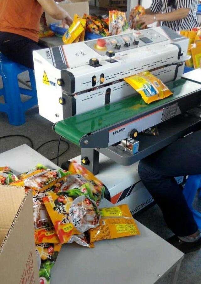 然后另一边的工作人员对搭配好的螺蛳粉进行再次称重,朋友介绍说每包螺蛳粉不能少于200g,否者就是不合格产品。工作人员对符合重量的螺蛳粉装进包装袋进行最后的封口,采取的是机器、人工结合的方式,流水生产速度挺快。