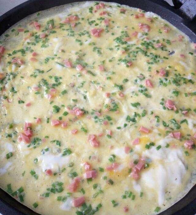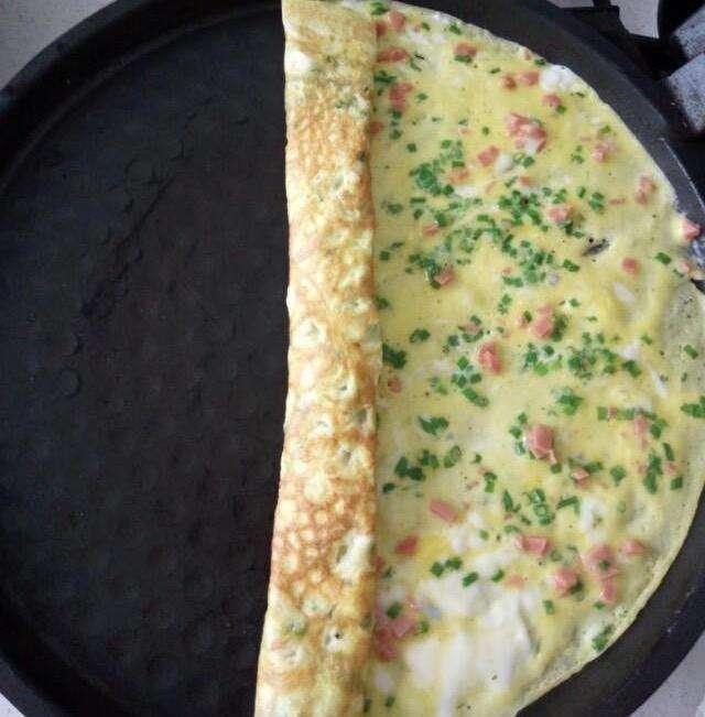 摊开铺薄后就成了葱花鸡蛋火腿饼,美味可口,看着超有食欲的样子,基本上鸡蛋液凝固后就可断电。