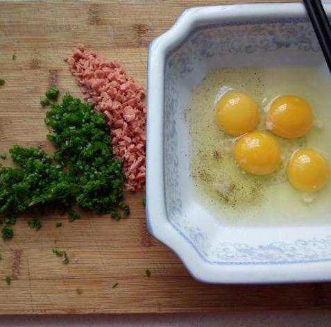 打好鸡蛋放入点黑胡椒,火腿肠和小葱切碎。