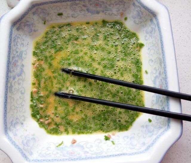 把鸡蛋液和小葱、火腿丁充分搅拌在一起。