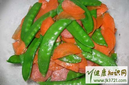 做法:火腿肠在油中炒熟,装起;荷兰豆同样的方法炒熟,倒如火腿肠再翻炒片刻,即可。装盘后再撒下黑胡椒粉。