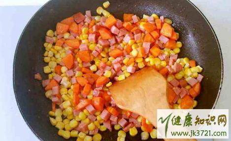 做法:火腿及小黄瓜切丁;葱切成葱花;鸡蛋打散成蛋液,备用;热一锅倒入适量的油,放入蒜末爆香后,放入作法1的蛋液炒至熟透;加入所有调味料与作法1的火腿丁、小黄瓜丁及玉米粒拌炒均匀后,加入葱花与香油拌匀后即可。