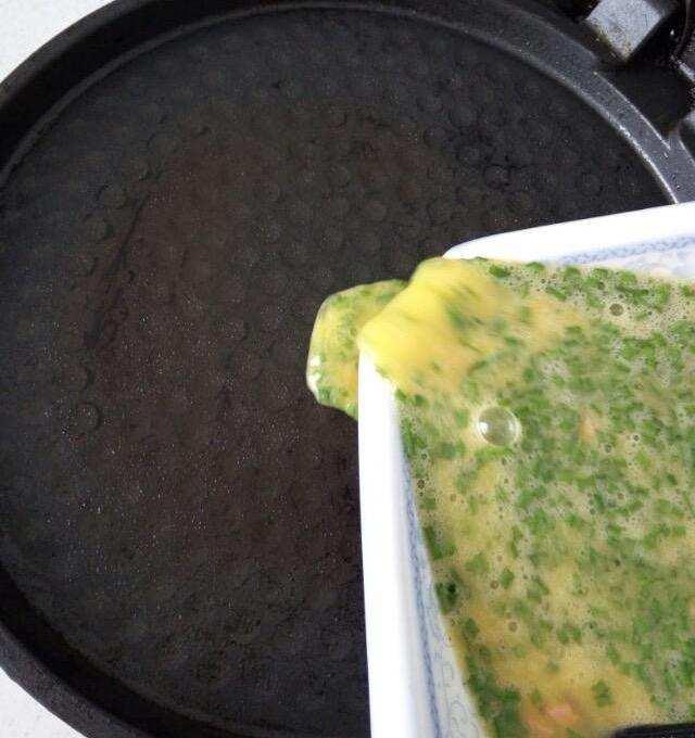电饼铛通电加热,倒入混合后的鸡蛋火腿液。