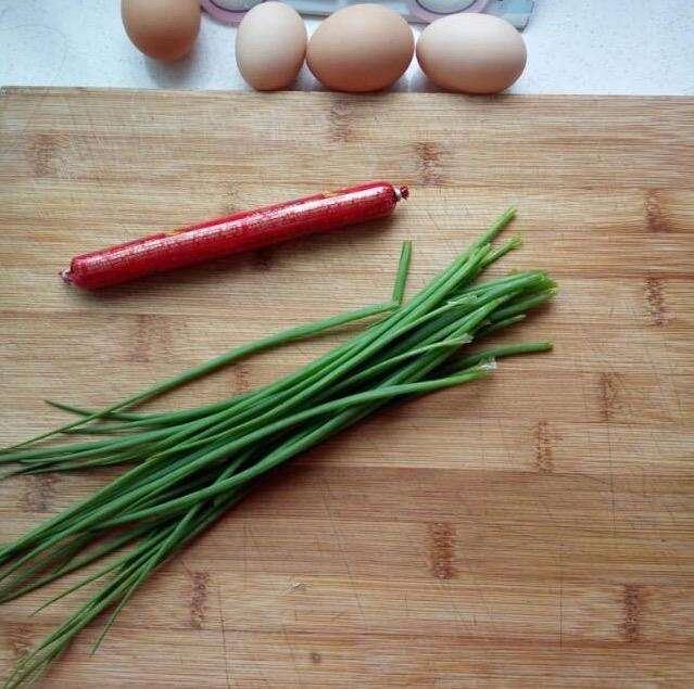 需要准备的食材有:火腿肠一根,小葱五、六根,鸡蛋4枚,粗看除了火腿肠其他食材都是超有营养的。