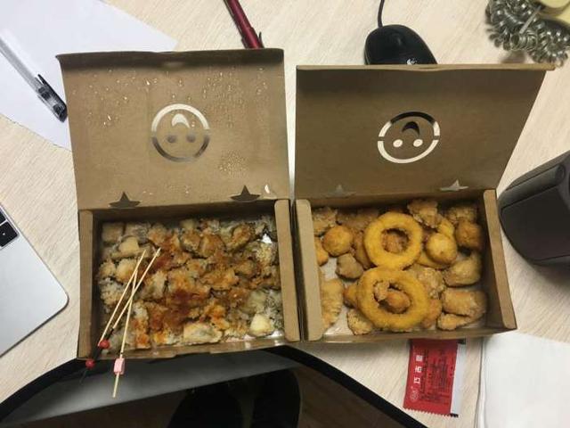 周三半价特惠,点了炸鸡套餐,不是肯德基、麦当劳的,就是那种山寨汉堡快餐小作坊,不过味道还不错。主要有孜然炸鸡、上校鸡块、鸡肉洋葱圈,鸡肉肯定是肉鸡无疑,但是小编确实喜欢吃炸鸡,周三一般点外卖比较划算,就尽情点自己喜欢吃的。