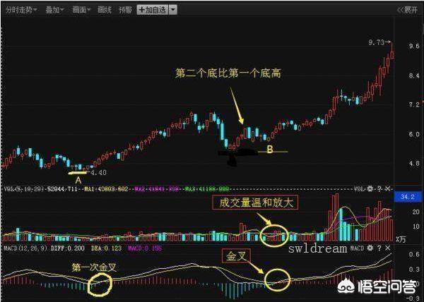 (2)第一次金叉的位置是在第二个底比第一个底低的位置,买点是第二个底MACD金叉的位置。