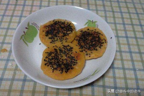 2红薯饼:红薯蒸好后趁热压成泥,加入糯米粉捏成面团,搓成条搓圆按扁,将红薯饼煎熟即可
