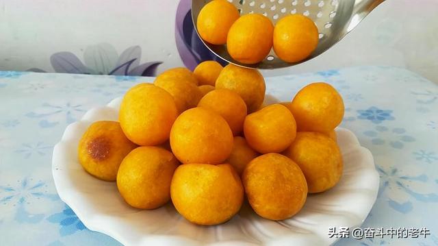 5.炸红薯丸子。红薯蒸好,去皮,加入少量面粉,或者糯米粉,都是可以的。因为糯米粉一般家里不常备。油锅五成热,入油锅,炸至金黄色捞出即可。