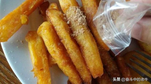 3、油温7、8成热时下油炸,因为地瓜较硬,所以小、中火多炸一会保证里面熟透。