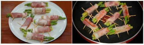 4.取一小片培根,放上2根芦笋段,然后卷起,用牙签固定封口。