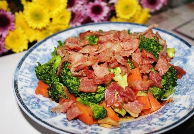 材料:西兰花 培根 胡萝卜 油 盐 蚝油
