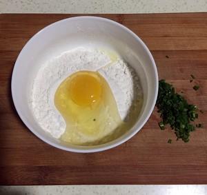 1.葱洗净切碎,鸡蛋打入面粉碗中