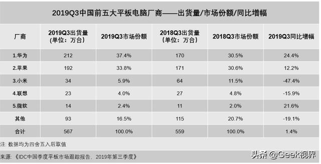 目前,平板电脑市场主要被华为、苹果占据,小米平板虽然排名第三,然而出货量相比前两者来说比较低,如下图所示。