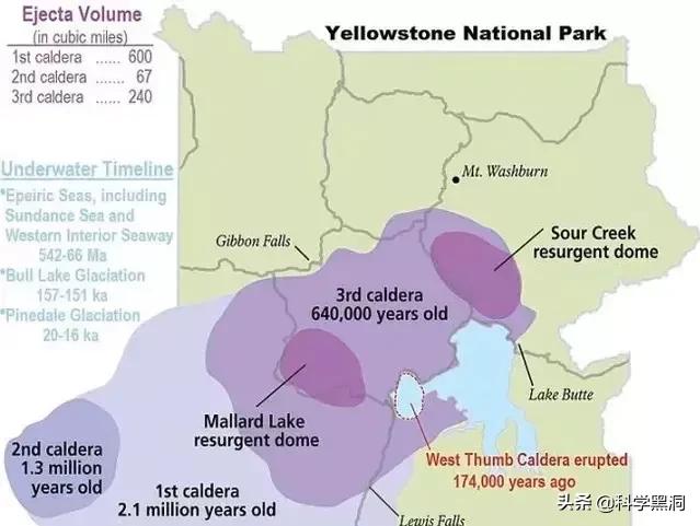 在历史上黄石超级火山共爆发了三次,第一次是在距今210万年前的越桔梅岭喷发,这次喷发是最严重的,共喷射出2500立方米的喷射物;第二次是在距今130万年前的亨利福克火山口喷发,共喷射出280立方米的喷射物;第三次是在距今64万年前的熔岩溪火山喷发,喷出物达1000立方米。从这三次喷发的时间上来看,黄石超级火山差不多是60万年左右喷发一次。