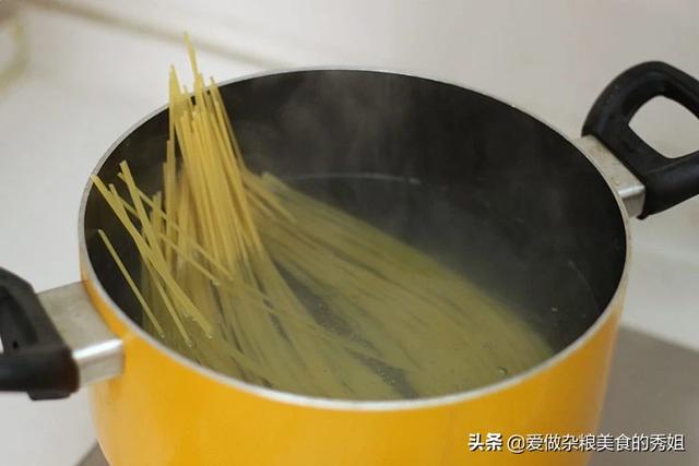 意大利面沸水入锅,锅里加入一点盐,煮8-10分钟,中途滚开一次加一点凉水。