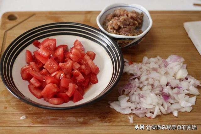 肉末里加入盐、料酒、淀粉腌一下,西红柿切小块,洋葱切丁。